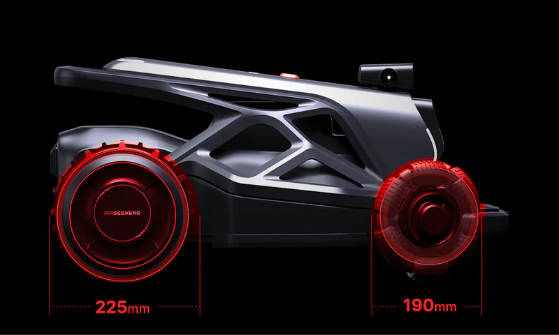 Tron četri lielie riteņi nodrošina izcilu saķeri un lielisku šķēršļu pārvarēšanas spēju, ļaujot tam bez piepūles tikt galā ar nelīdzenu reljefu un nelīdzeniem zālājiem — bez rievām, bez iesprūšanas.