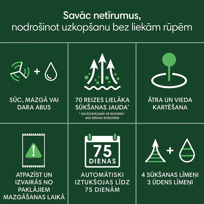 Netīrumi un putekļi nav redzami, jo tie tiek iztukšoti AutoEmpty stacijā līdz 75 dienām